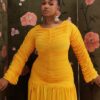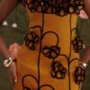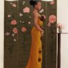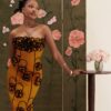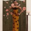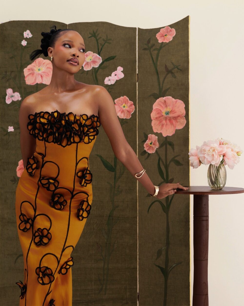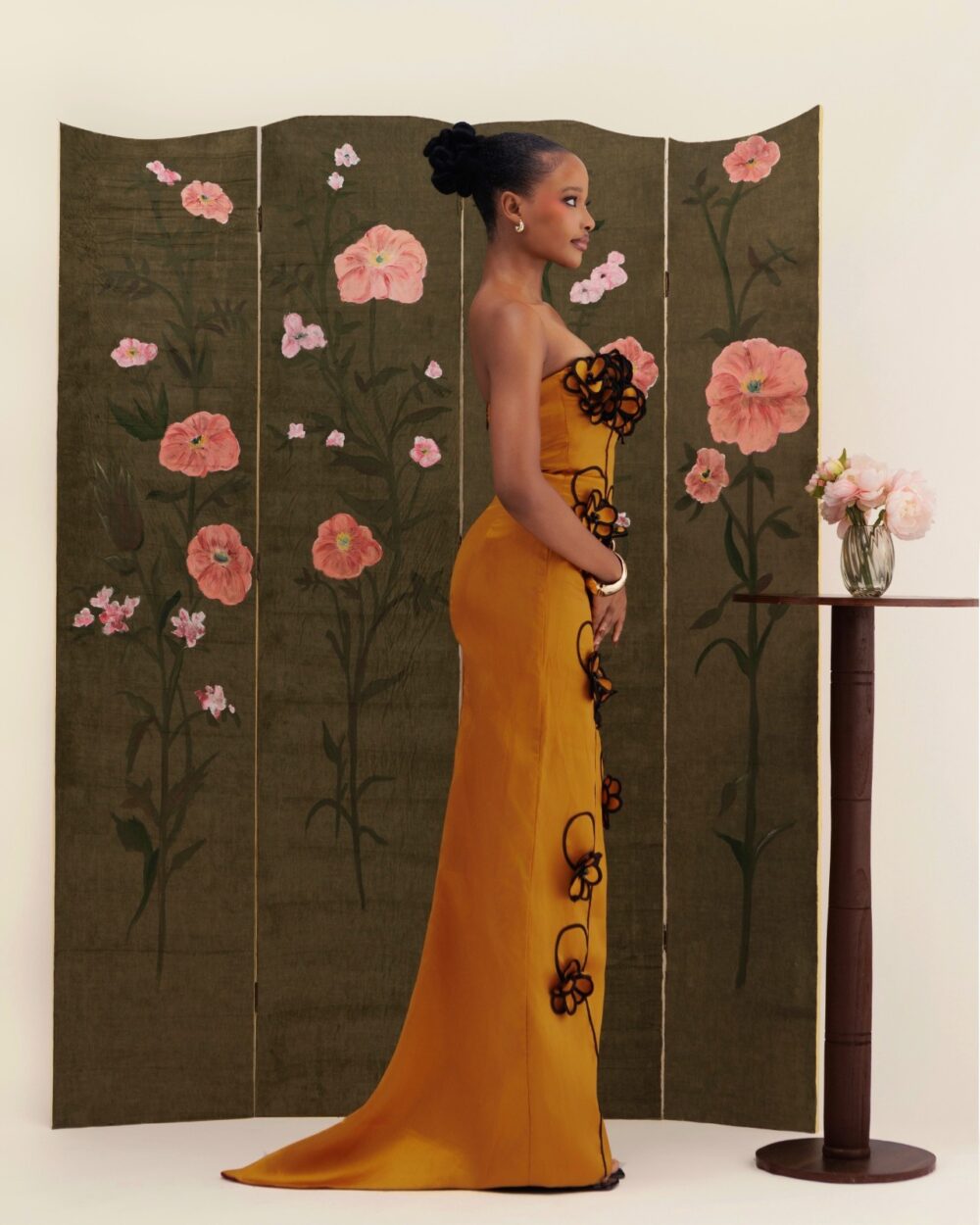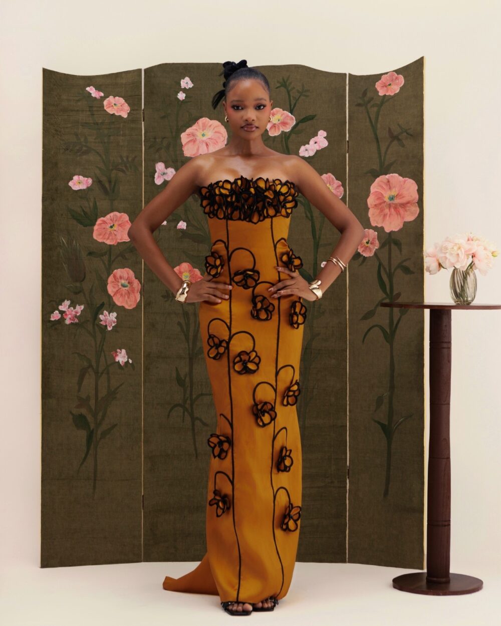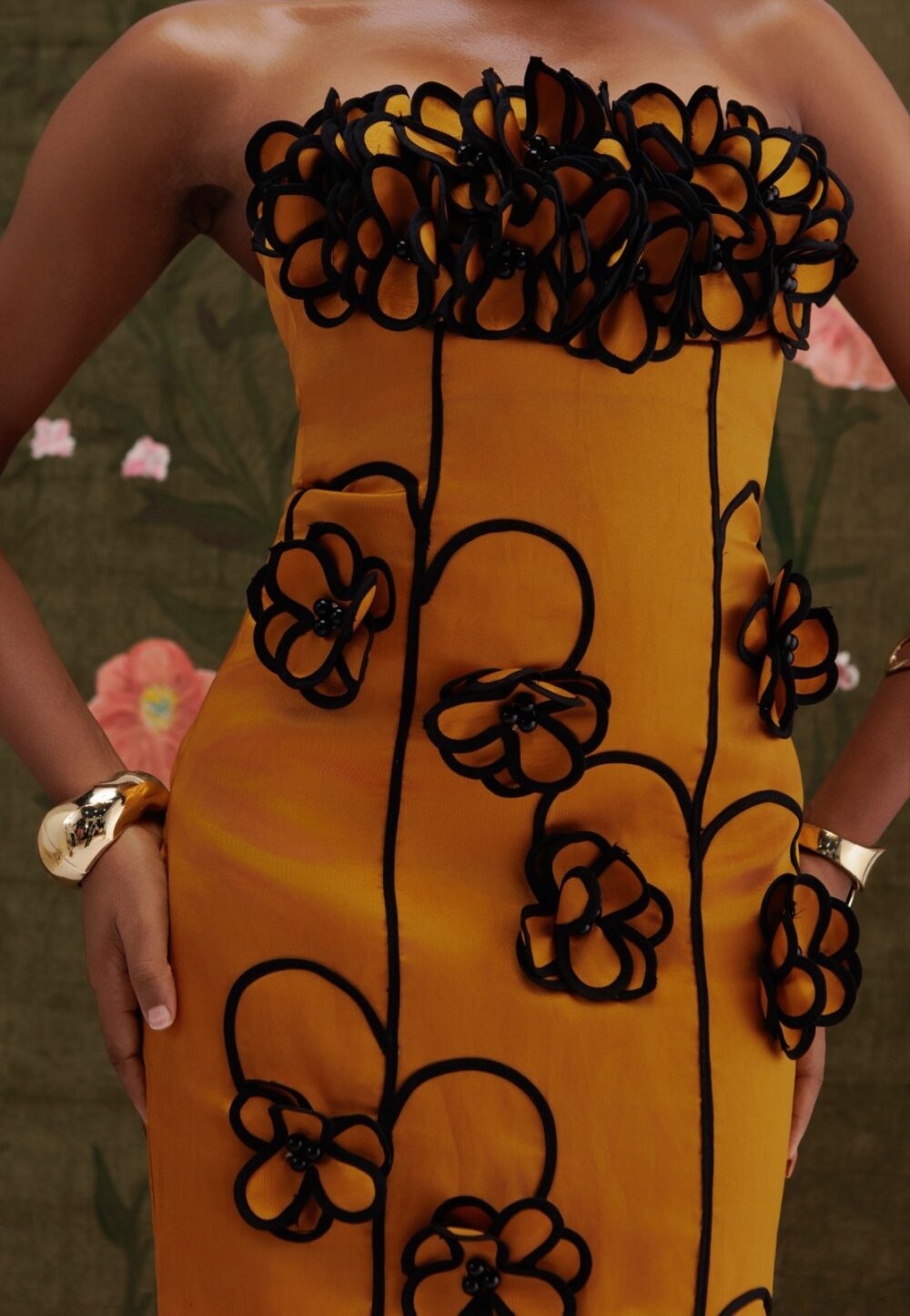 A sculpted silhouette adorned with handmade floral appliqués, framed by a structured petal neckline.