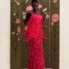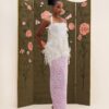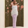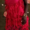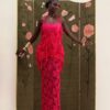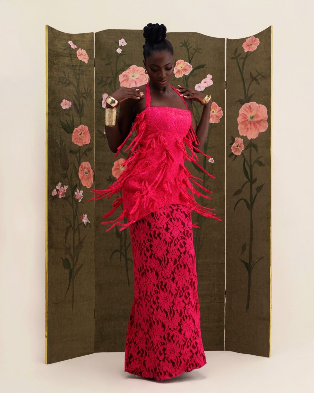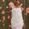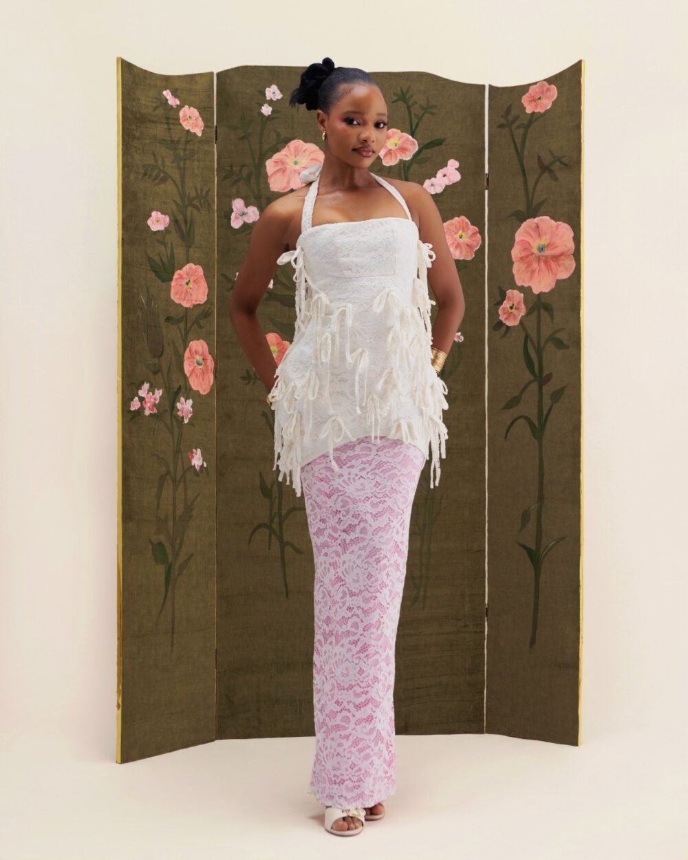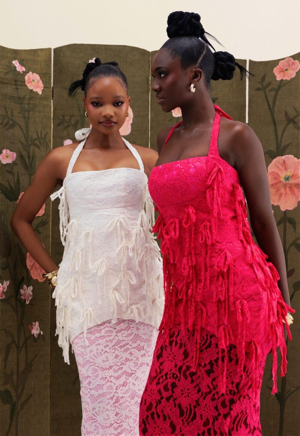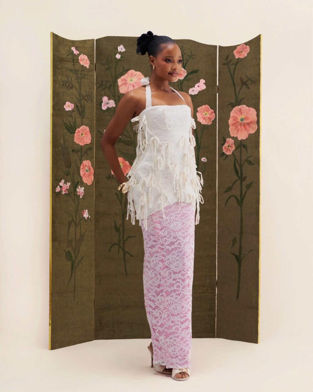 The Luna set is a soft lace two-piece featuring a fitted skirt and a textured fringe top with a halter neckline. Light, feminine, and effortlessly striking, it’s perfect for making a subtle statement.